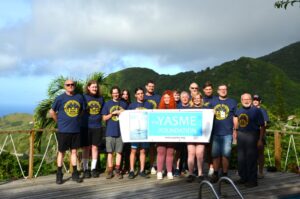 The on-island team (from left): Gregg, W6IZT; Connor, KD9LSV; Aaron, KC1SJR; Vincent, PC2Y; Marlee, KC1YBR; George, YO9LIG; Emilia, YO8YL; Ewan, N7EWN; Suzan, PD3SZN; Robin, W7YED; Jeff, NM1Y; Glenn, WØGJ; Matúš, OM8ATE; Dominik, DL1DJH, and Shelley, XYL of NM1Y.